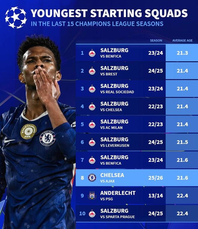 欧冠近15个赛季最年轻首发阵容Top10:1. 萨尔茨堡红牛(vs本菲卡) 23-24赛季 21.3岁2. 萨尔茨堡红牛(vs布雷斯特) 24-25赛季 21.4岁3. 萨尔茨堡红牛(vs皇家社会) 23-24赛季 21.4岁4. 萨尔茨堡红牛(vs切尔西) 22-23赛季 21.4岁5. 萨尔次堡红牛(vsAC米兰) 22-23赛季 21.4岁6. 萨尔次堡红牛(vs勒沃库森) 24-25赛季 21.5岁7. 萨尔次堡红牛(vs本菲卡) 23-24赛季 21.6岁8. 切尔西(vs阿贾克斯) 25-26赛季 21.6岁9. 安德莱赫特(vs巴黎圣日耳曼) 13-14赛季 22.4岁10. 萨尔次堡红牛(vs布拉格斯巴达) 24-25赛季 22.4岁切尔西vs阿贾克斯首发阵容:菲利普-约恩森(23岁);莫伊塞斯-凯塞多(23岁)、韦斯利-福法纳(24岁)、阿达拉比奥尤(28岁)、哈托(19岁);法昆多-博纳诺特(20岁)、拉维亚(21岁)、恩佐-费尔南德斯(24岁);埃斯特旺(18岁)、吉乌(19岁)、比诺埃-吉滕斯(21岁)萨尔茨堡红牛北京时间10月23日,切尔西在欧冠联赛阶段第3轮的比赛中主场5-1大胜10人作战的阿贾克斯,吉乌、莫伊塞斯-凯塞多、恩佐-费尔南德斯、埃斯特旺以及泰里克-乔治分别进球。赛后根据德转的统计,切尔西本场比赛首发阵容的平均年龄仅为21.6岁,为欧冠近15个赛季第8年轻。