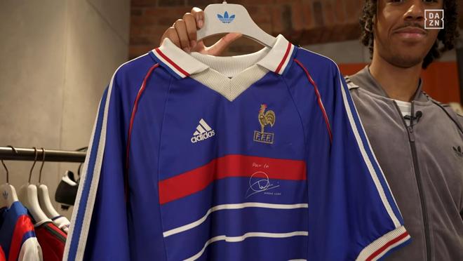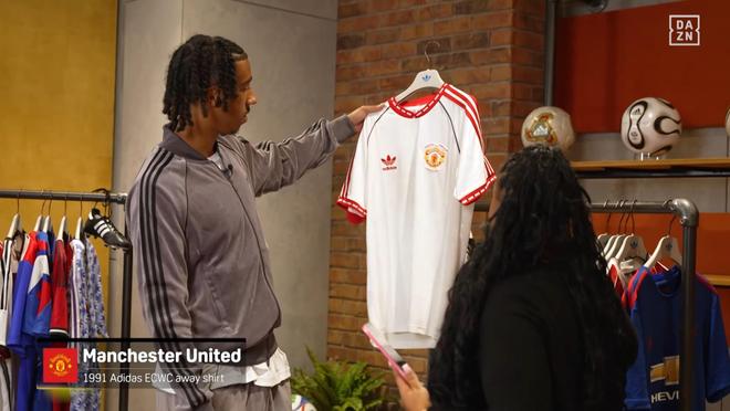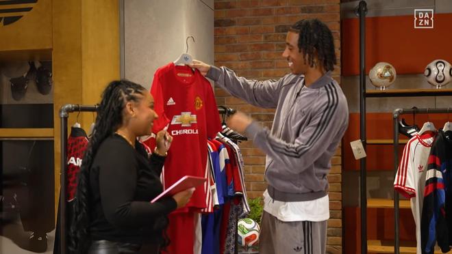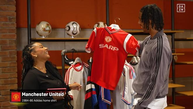 法国球员在英超也有不少传奇,我们得聊一位特别的人——坎通纳。你对他和这件球衣有什么印象?真漂亮。大家都知道他为曼联做了什么,他是这里的传奇,在法国也是。我以前没见过这件球衣,因为那时候我还没出生(笑)。但这件真的很棒,坎通纳是俱乐部的象征之一。如果今天你可以带一件球衣回家穿,你会选哪件?我喜欢复古款的,因为更有型。可能选曼联的吧。这件虽然对我来说有点小,但真的很经典,从徽标到剪裁都很复古。