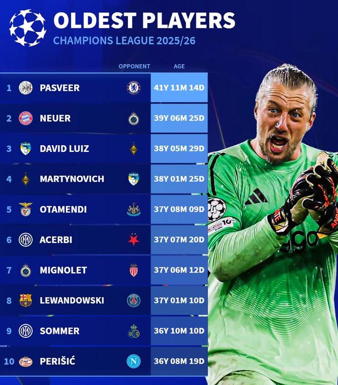 本赛季欧冠最年长出场球员前10:1. 帕斯维尔(阿贾克斯) 41岁11个月14天(vs切尔西)2. 诺伊尔(拜仁慕尼黑) 39岁6个月25天(vs布鲁日)3. 大卫-路易斯(帕福斯) 38岁5个月29天(vs阿拉木图凯拉特)4. 马蒂诺维奇(阿拉木图凯拉特) 38岁1个月25天(vs帕福斯)5. 奥塔门迪(本菲卡) 37岁8个月9天(vs纽卡斯尔联)6. 阿切尔比(国际米兰) 37岁7个月20天(vs布拉格斯拉维亚)7. 米尼奥莱(布鲁日) 37岁6个月12天(vs摩纳哥)8. 莱万多夫斯基(巴塞罗那) 37岁1个月10天(vs巴黎圣日耳曼)9. 索默(国际米兰) 36岁10个月10天(vs亚特兰大)10. 佩里西奇(埃因霍温) 36岁8个月19天(vs那不勒斯)