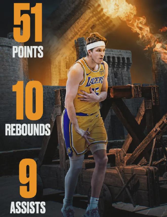 结果里夫斯站了出来,他没有让湖人崩盘,而是扮演好了持球大核的角色。这场比赛,里夫斯打得非常给力,首发出战39分钟,22投12中狂砍51分11篮板9助攻的准三双数据,实在是有点太猛了。
