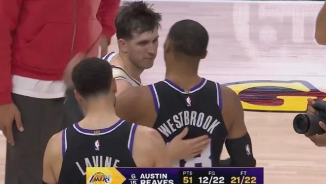 里夫斯单场51分准三双,破了个人NBA生涯得分纪录,这个落选秀真的太牛逼了,是NBA自1954年的尼尔·约翰斯顿以来首位拿到50分两双的落选秀,也是NBA史上落选秀的第4次单场50分。詹姆斯不在,东契奇不在,里夫斯硬生生干掉了眼里有火的威少爷,你想到了吗?