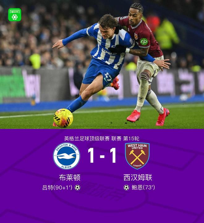 布莱顿11西汉姆,鲍恩小角度倒地破门,吕特扳平比分