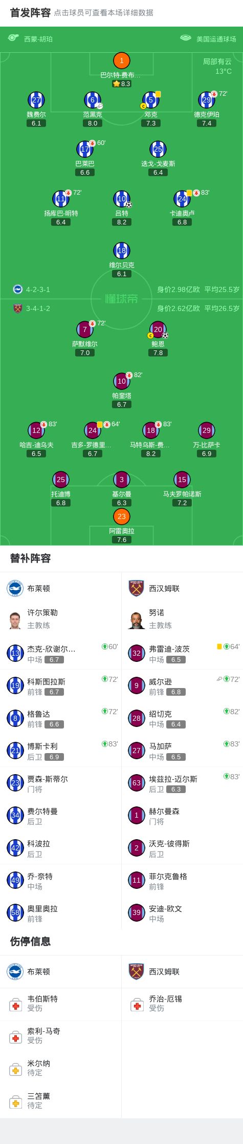 北京时间12月7日,英超联赛第15轮,布莱顿坐镇主场迎战西汉姆联。上半场,帕奎塔远射造险;下半场,威尔逊助攻,鲍恩倒地情况下小角度破门。随后,吕特乱战中小角度破门扳平比分。费布鲁亨屡献神扑。最终双方1比1握手言和。关键事件第73分钟,鲍恩倒地情况下小角度破门,西汉姆联1-0布莱顿