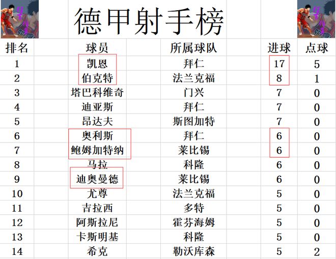 射手榜方面,凯恩上演帽子戏法,让德甲金靴越来越没有悬念,凯恩已经比第2的伯克特多了一倍还有剩的。迪亚斯,塔巴科维奇和昂达夫7球并列第3,迪奥曼德帽子戏法,鲍姆加特纳传射建功,两人追上奥利斯,马拉,6球并列第6。