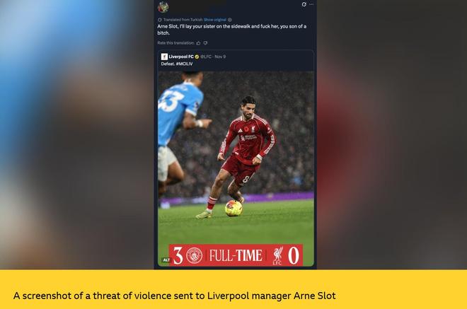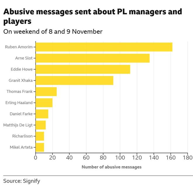 足坛部分人士已无奈接受辱骂不可避免的现实。“现在这似乎是行业常态,”纽卡斯尔主帅埃迪-豪表示。“我的建议是尽量远离这些言论,让自己心理足够强大,不去理会。但无论你愿不愿意,总会有人把这些内容告诉你。”Meta已部署相关系统以帮助屏蔽和过滤辱骂内容,X平台则推出了显示账号所属国家或地区的工具。英媒就平台上的辱骂问题联系了X和Meta,但两家公司均未回应。“极其恶劣的暴力内容”在伦敦市中心的一间办公室里,Signify的小团队正在安静地筛选数千条帖子。比赛中每出现一次争议瞬间,辱骂信息的数量就会激增。帖子中充斥着猴子表情、种族歧视言论、针对教练家人的强奸威胁,甚至死亡威胁——这些仅仅是由球场上的行为引发的。人工智能系统标记的每一条疑似辱骂信息都会经过人工两轮审核,只有违反社交媒体平台自身准则的内容才会被认定为确凿辱骂。辱骂信息的最大激增发生在11月8日托特纳姆热刺2-2戏剧性战平曼联的比赛期间,这场比赛出现了两粒补时进球,赛后两家俱乐部的主帅和多名球员遭到集中辱骂。BBC看到的部分信息中,包含针对阿莫林的死亡威胁,其中一条写道:“杀了阿莫林——谁来干掉这个肮脏的葡萄牙人。”