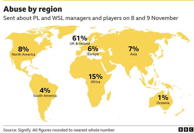 2023年10月生效的《在线安全法》规定社交媒体平台负有法定注意义务。这意味着平台有法律义务主动识别并移除非法内容,如威胁、骚扰或仇恨言论。英国通信管理局(Ofcom)现为负责监督平台遵守该法律的独立监管机构。但社交媒体平台辩称,言论自由权让他们不愿审查或删除内容。Signify坚称,线上严重辱骂和威胁问题正在恶化。“我们发现检测到的辱骂水平同比增长约25%,”该公司首席执行官乔纳森-赫什勒说。“我们理解平台在言论自由方面的立场,但我们所谈论的部分内容极其恶劣。”“都是些非常恶毒的死亡威胁和极其可怕的暴力内容。如果那些绝对的言论自由至上者看到这些信息,他们就不会质疑为什么这些内容会被举报,为什么需要采取行动。”女子超级联赛中的威胁与恐同言论11月8日切尔西1-1战平阿森纳的比赛中出现的争议事件,引发了WSL赛事中97条已核实辱骂信息的绝大部分。超过一半的辱骂针对切尔西主帅邦帕斯托,包括暴力威胁和恐同言论。“人们认为躲在屏幕后面就能随心所欲地说话,”邦帕斯托说。“这很可怕——我想站出来反对这种行为。”“我有家庭,还有孩子。他们不想在网上看到这些评论。他们还那么小,人们需要意识到这对他们可能造成的影响。”“威胁是个大问题,因为女子足球的安保水平和男子足球不一样。”“辱骂会给球员带来真正的心理问题,后果可能非常严重。”前切尔西球员、现英格兰后卫杰斯-卡特在2025年欧洲杯期间曾遭受严重的线上种族歧视,邦帕斯托认为平台本身应承担很大责任。“社交媒体公司没有履行职责,没有承担起应有的责任,”邦帕斯托说。“如果我们只能等待他们采取行动,我认为这种状况会持续太久。”“我希望现在男女足所有俱乐部都能积极主动,尽可能保护相关人员。”