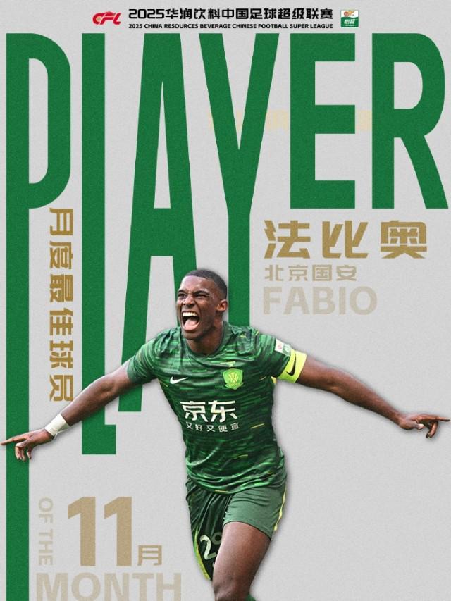 - 中超 | 2场贡献6球1助攻+夺得金靴,法比奥当选中超11月最佳球员
