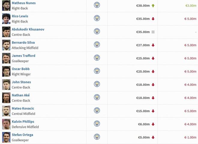 曼城球员身价变动(单位:欧元)哈兰德 2亿(上涨2000万)罗德里 7500万(下跌1500万)格瓦迪奥尔 7000万(下跌500万)多库 6500万(上涨1000万)赖因德斯 6500万(下跌500万)马尔穆什 6500万(下跌1000万)谢尔基 5000万(上涨500万)萨维尼奥 4500万(下跌500万)尼科-冈萨雷斯 4500万(上涨500万)多纳鲁马 4500万(上涨500万)奥赖利 4000万(上涨1000万)马特乌斯-努内斯 3800万(上涨300万)里科-刘易斯 3500万(下跌500万)伯纳多-席尔瓦 2700万(下跌500万)特拉福德 2500万(下跌500万)奥斯卡-鲍勃 2500万(下跌500万)斯通斯 1800万(下跌400万)阿克 1800万(下跌400万)科瓦契奇 1500万(下跌500万)卡尔温-菲利普斯 600万(下跌400万)奥尔特加 500万(下跌100万)贝蒂内利 50万(下跌10万)(注:榜单中未列及的球员维持原身价,本期身价没有更新)【上咪咕独家看英超】