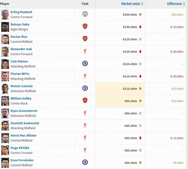 北京时间12月9日,德转英超球员身价更新,哈兰德涨至2亿欧,萨卡降至1.3亿欧,伊萨克降至1.2亿欧。