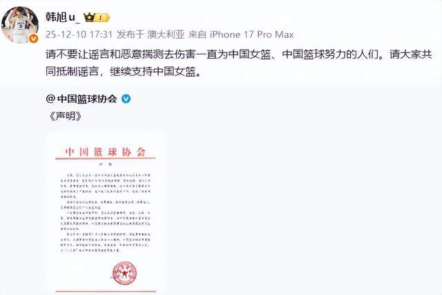 北京时间12月10日下午,中国篮协突然发布了一张红头文件,为中国女篮教练员和运动员发声,力挺中国女篮。连远在澳大利亚的韩旭也站了出来,一起发声。