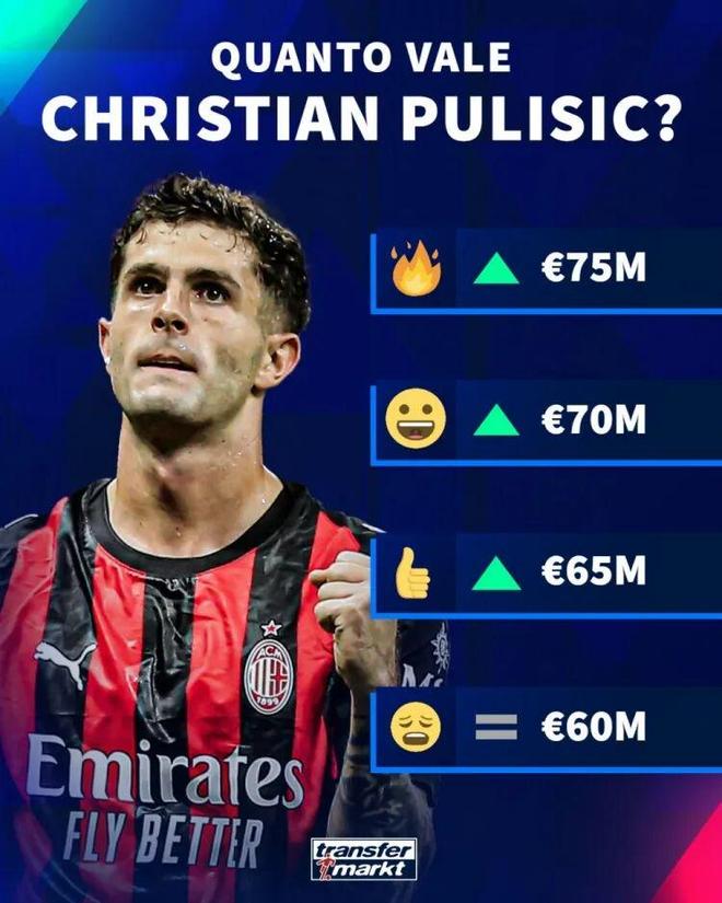 米兰圈德国转会市场预热普利西奇的身价变化,最高可能达到7500万欧元。